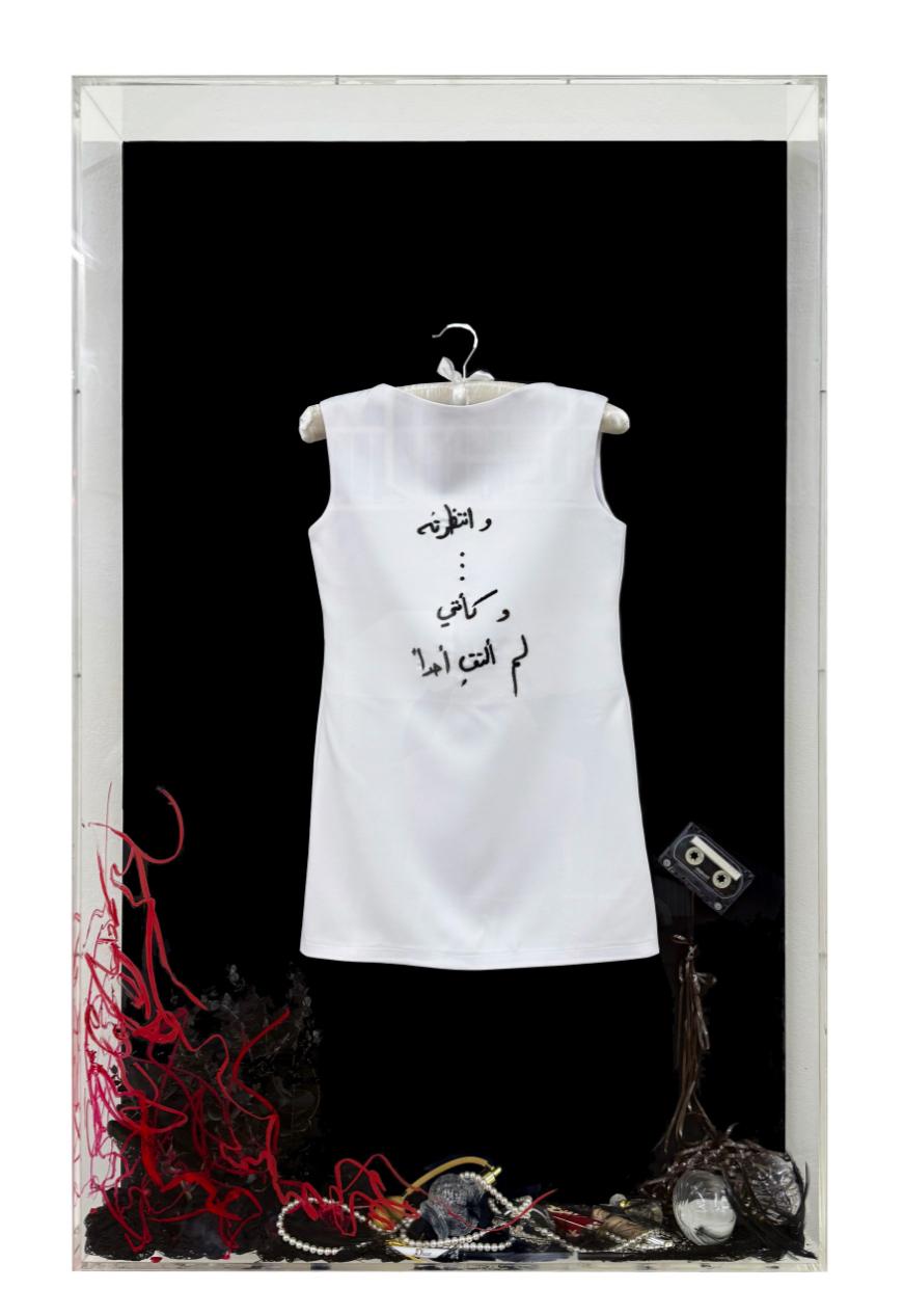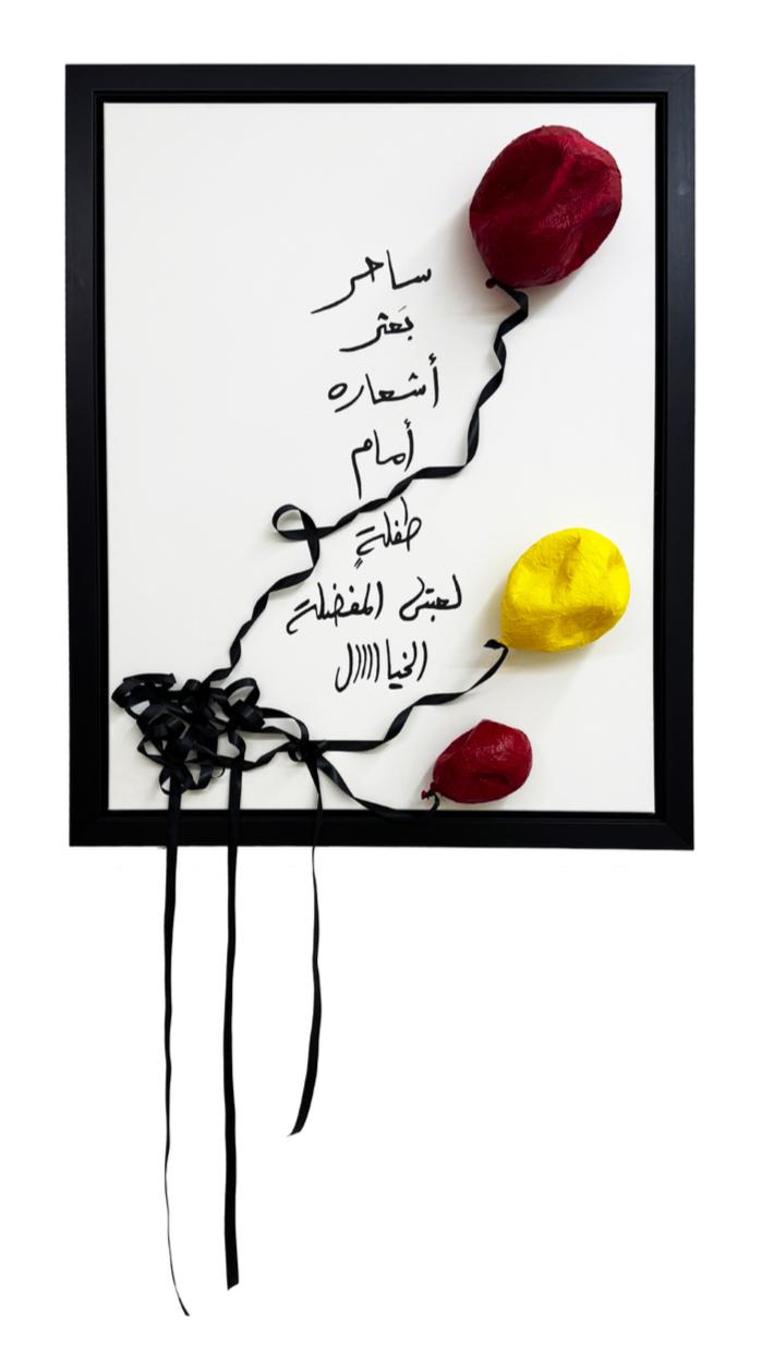 Oui. Au départ j’écrivais sur des toiles, puis j’ai voulu utiliser le 2D et 3D, en faisant des sculptures à partir de papier, de ballons, de mannequins, ou de plexiglas. Chaque texte dicte sa forme. L’un parle de l’attente d’une personne qui ne vient jamais, cela s’inscrit sur une robe en suspens. Un autre évoque une liberté offerte, puis perdue…et se déploie sur un cadre ouvert, à moitié vide, pour montrer cette liberté incomplète. J’aime transformer la phrase en espace.