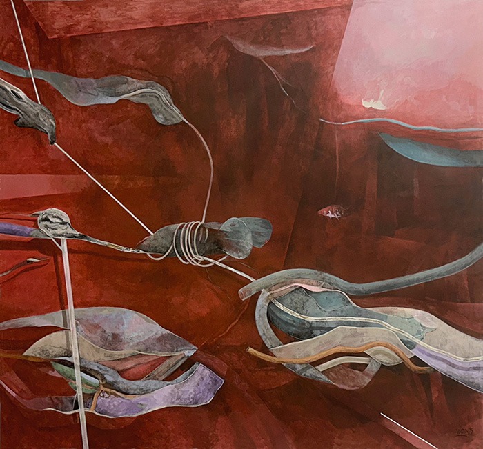 Dans Aquarium, les restes industriels et organiques dérivent comme des souvenirs immergés. L’œuvre s’inspire des marais d’Irak, ce berceau de civilisations devenu une métaphore du monde qui s’asphyxie mais ne meurt pas. Elle évoque aussi Gaza, Beyrouth, tous ces lieux où la destruction se répète sans éteindre complètement le mouvement. Entre l’eau et la terre, Abidin peint la texture même du désastre.
