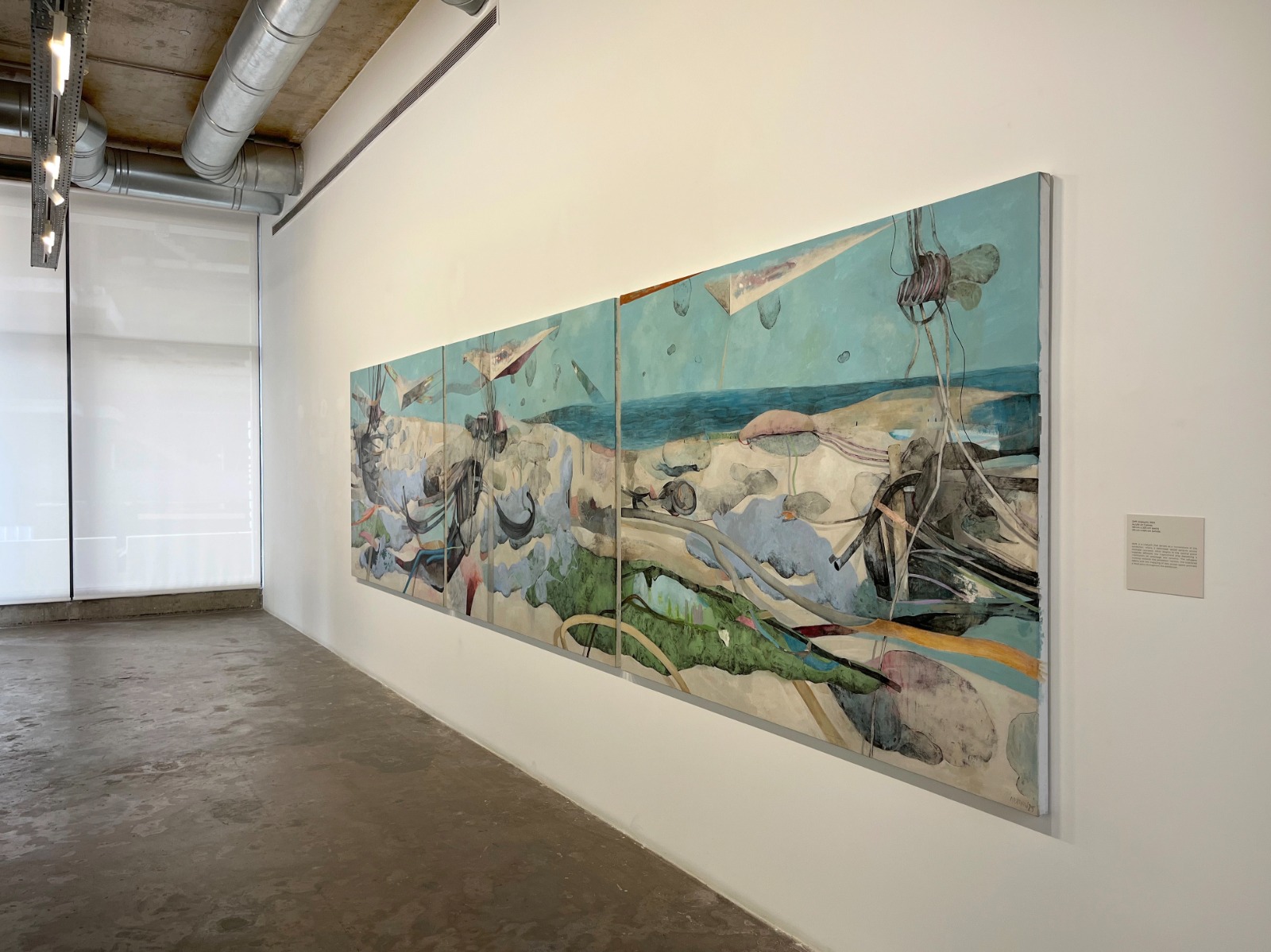 L’exposition s’articule autour du triptyque Drift, immense navire démantelé qui s’étend sur trois panneaux, avec des silhouettes humaines, presque effacées, un bateau en ruine, et l’horizon, qui est fin et un recommencement. Cette ligne d’horizon, qui à Bagdad accompagne le regard à perte de vue.