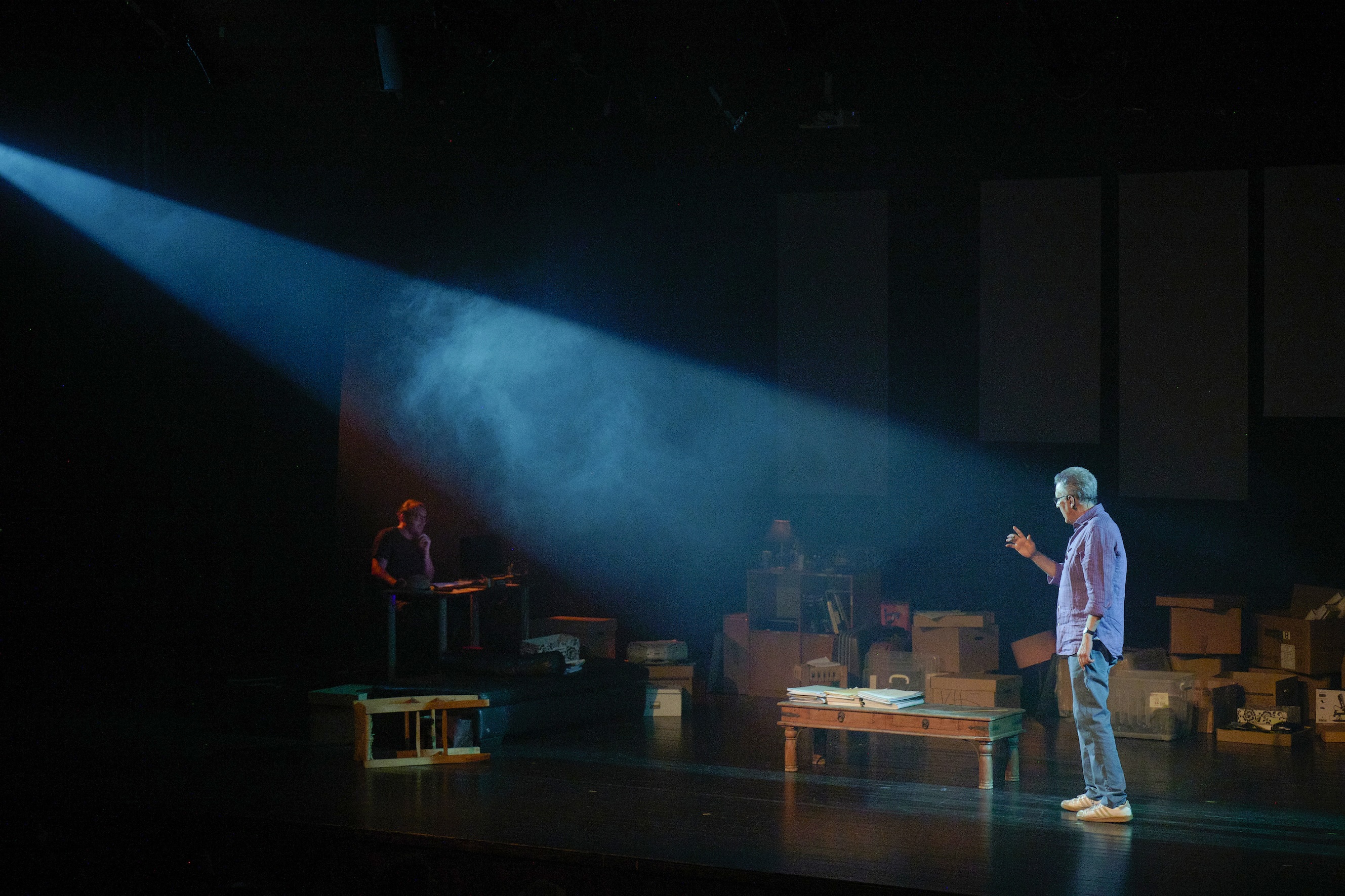 Le décor, d’abord, dit tout : un fauteuil noir, des cartons, des cassettes audio, des paniers débordant de mémoire. C’est un désordre vivant, familier, où chaque objet semble contenir un fragment d’histoire. Aractingi y dépose les traces de son passé : des bandes enregistrées, la voix de sa mère, celle de sa nounou — to2borni, « enterre-moi », murmure-t-elle dans cette langue du cœur. Le public est alors pris dans une émotion si simple et si vraie : celle de reconnaître, dans la voix d’un autre, la tendresse perdue des siens.