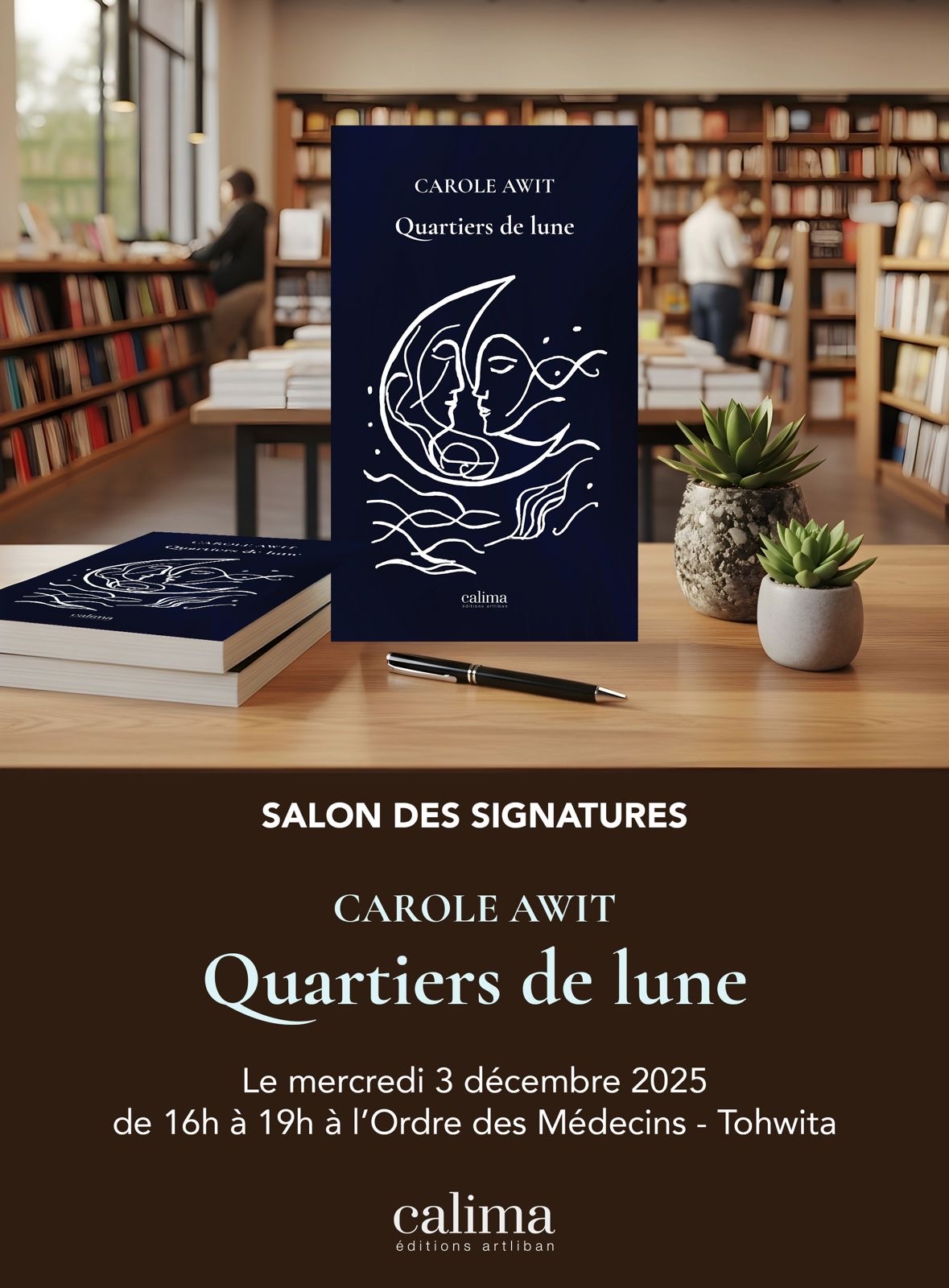 Carole Awit dédicacera son recueil Quartiers de lune le mercredi 3 décembre 2025 de 16h à 10 h à l’Ordre des médecins – Tohwita lors du salon des signatures organisé par les éditions Artliban Calima.