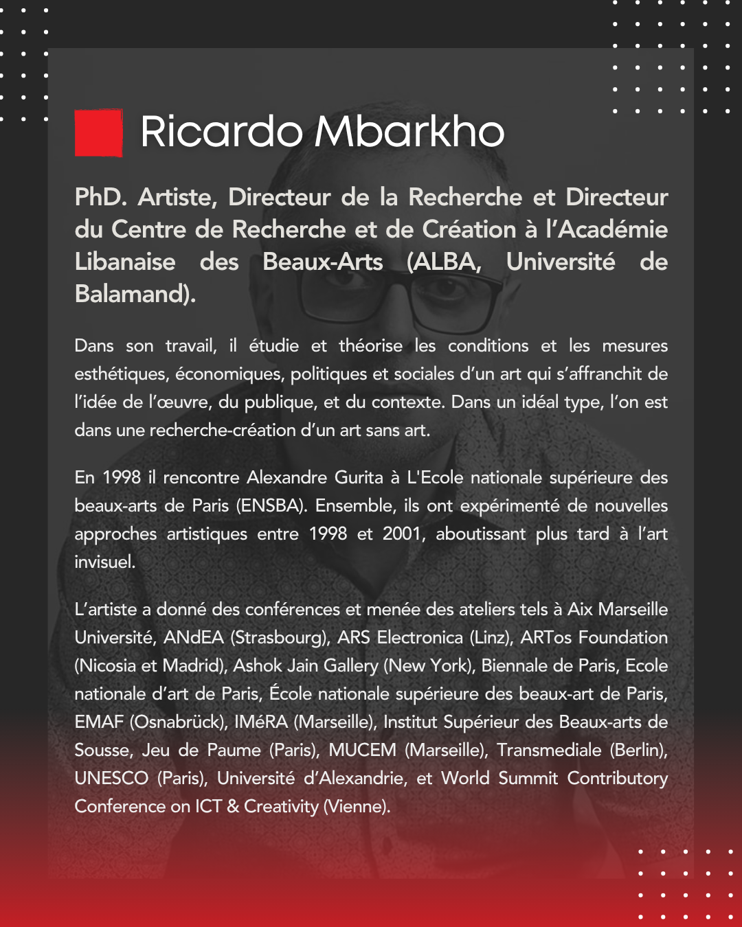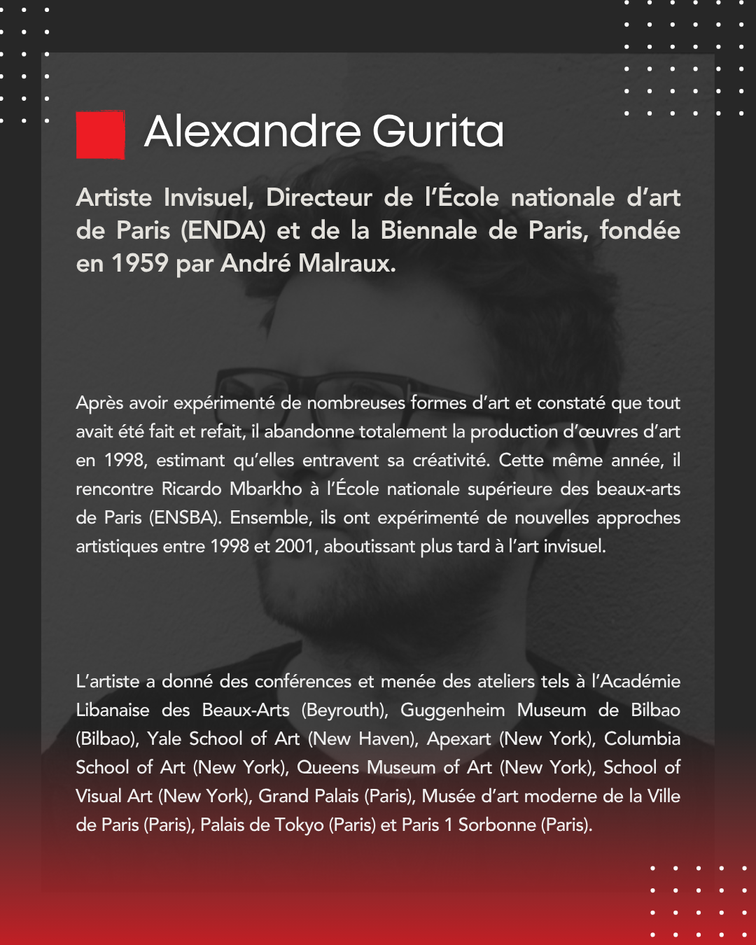 C’est à cette réflexion radicale que nous convie la conférence « Introduction à l’art invisuel », donnée par Alexandre Gurita, artiste invisuel et Directeur de la Biennale de Paris et de l'Ecole nationale d'art de Paris (ENDA), et Ricardo Mbarkho, artiste invisuel et Directeur de la recherche et du Centre de recherche et de création (CRC) à l’Académie Libanaise des Beaux-Arts (ALBA – Université de Balamand).